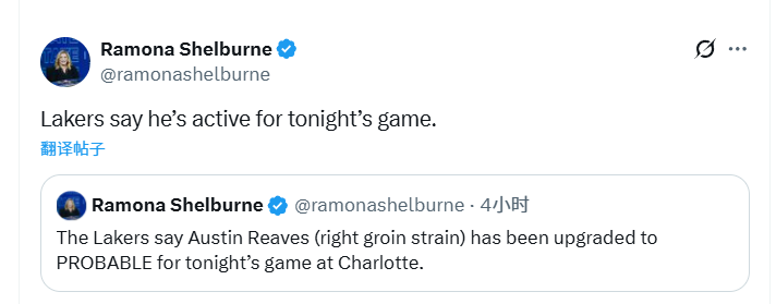最新消息顯示,里夫斯可以出戰(zhàn)本場(chǎng)比賽,而稍早時(shí)湖人隊(duì)曾宣布,里夫斯(右側(cè)腹股溝拉傷)的出戰(zhàn)狀態(tài)已升級(jí)為大概率出戰(zhàn)。