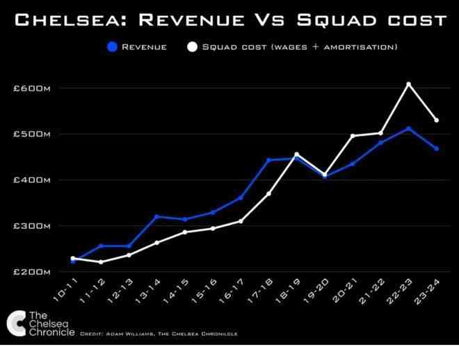 切爾西收入與陣容成本對比折線圖