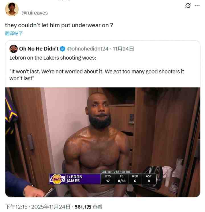 賽后,詹姆斯在更衣室接受采訪時(shí)僅用一條毛巾遮住重要部位,并不時(shí)調(diào)整。