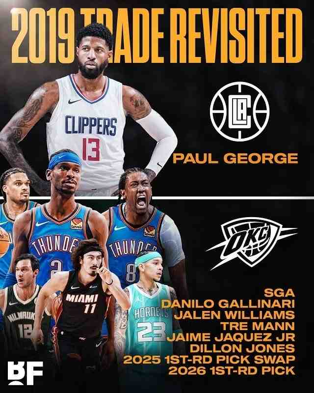 喬治當年交易詳情:快船將亞歷山大、加里納利、四個不受保護的首輪簽+一個樂透保護的首輪簽以及兩個首輪簽交換權送至雷霆。