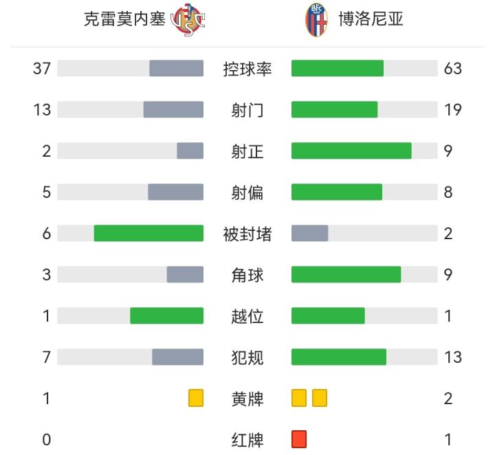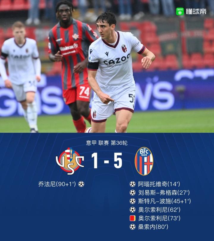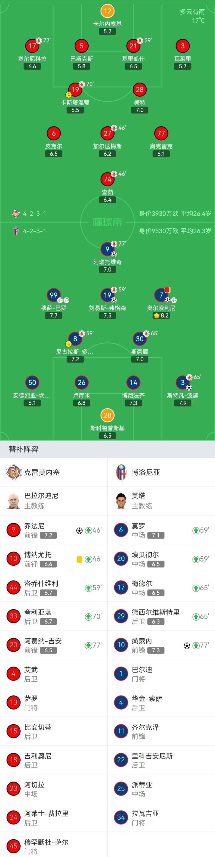 值得一提的是,奧爾索利尼成為全場最出色的球員。他的進攻讓防守方毫無還手之力,最終貢獻了兩個進球,最終也因為連黃被罰下場。另外,穆薩-巴羅的連傳同樣是球隊的進攻亮點之一。相比之下,克雷莫內塞表現并不盡如人意,防線漏洞百出,變成了博洛尼亞的陪練。