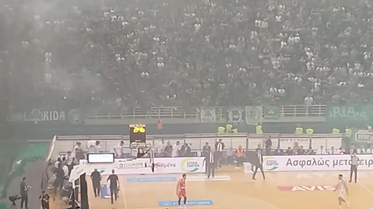 現(xiàn)場觀眾觀戰(zhàn)的希臘巨星字母哥不得不提前離開球館,此外球迷們將各種物品扔向球場周圍的防護網(wǎng)。至少有兩枚煙霧彈在現(xiàn)場爆炸,導致裁判被迫提前吹停比賽。