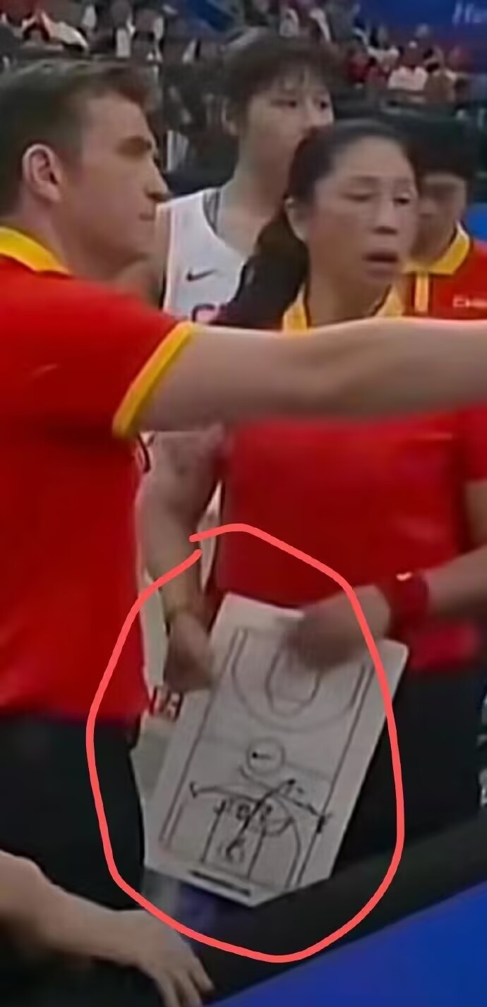 這就是昨天中國女籃最后一攻的戰術板,電梯門后接球,然后給到側翼的王思雨,鄭薇跟我說,當時讓王思雨閱讀防守,有機會就攻了,同時也有其他三個接應點與攻擊點。
